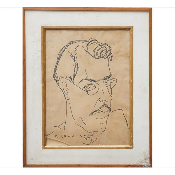 EspañolCLOVIS GRACIANO, Auto-Retrato, Desenho à Nanquim, ACIE,(m.i). (vidro da moldura no estado / com fungos)