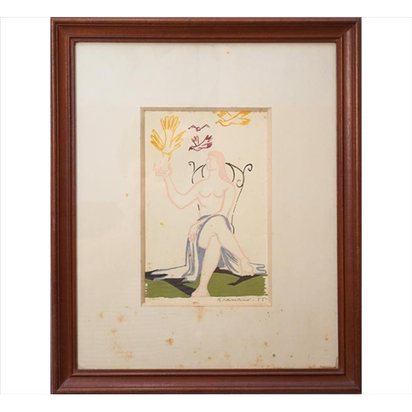 EspañolCLOVIS GRACIANO, Figura Femina e Pássaros, Guache sobre Papel, ACID, 25,5 x 17cm (m.i). Datado 1955 (com selo de catalogação da Obra de Clovis Graciano no verso, numerada 584/665) (com fungos)