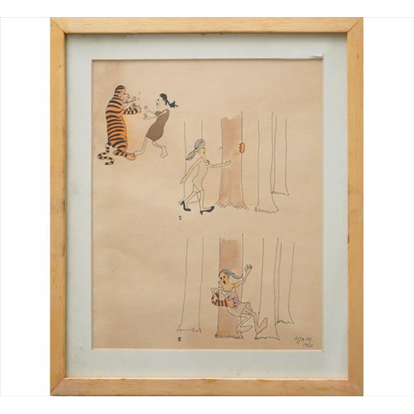 EspañolGERDA BRENTANI, Charge com Tigre e Mulheres, Desenho à Nanquim e Aquarela, ACID, 25 x 21cm. (m.i). Datado 1960