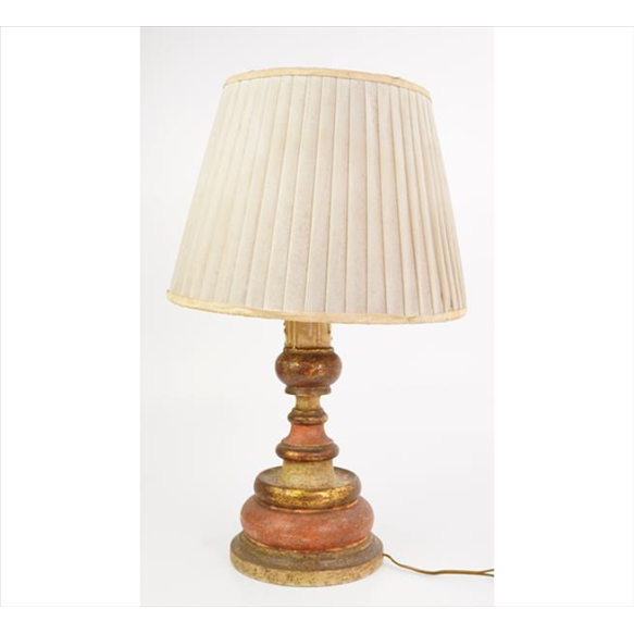EspañolAbajur/tocheiro de madeira torneada, policromada e dourada, cúpula de tecido. Alt. 50 x 30cm. Brasil, início séc. XX