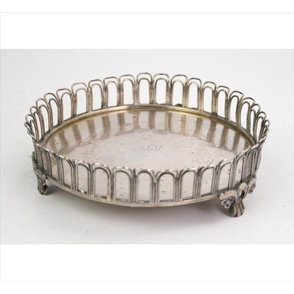 EspañolSalva de prata , estilo de transição D. Maria I / Império, galeria geométrica fenestrada, iniciais gravadas na reserva central. Alt. 06 x 19cm. Brasil inícioséc. XIX ( 330g )