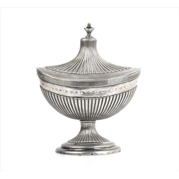EspañolBomboniere de prata-de-lei estilo D. Maria I, contraste P Coroa, ricamente decorada com cenluras e rosáceas. Alt.20 x 16 x 10cm. Portugal, séc. XIX ( 505g )