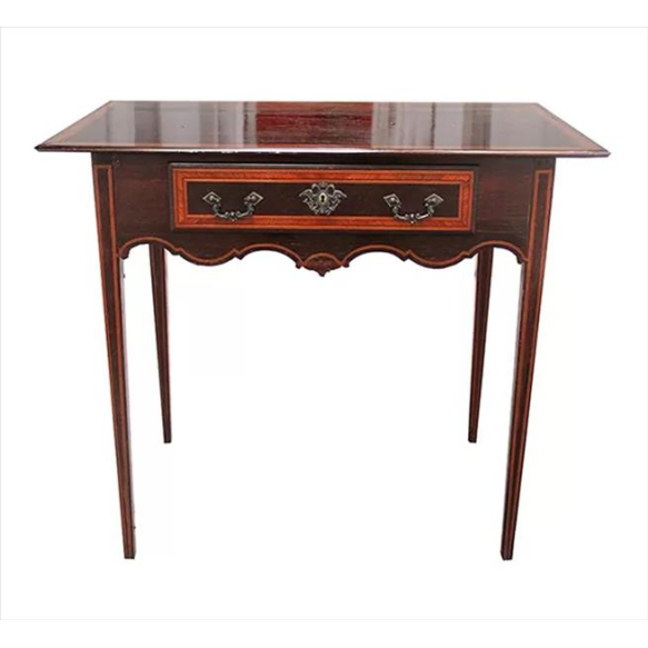 EspañolMesa lateral de madeira jacarandá, estilo e época D. Maria I, estrutura reta, saia recortada, ornamentada com marcheterie nas bordas, contém uma gaveta frontal com puxadores e fechadura de bronze. Alt. 80 x 92 x 58cm. Brasil início séc. XVIII/XIX.