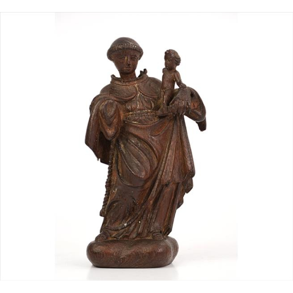 EspañolSANTO ANTÔNIO, Imagem de madeira nobre jacarandá finamente entalhada. Alt. 17 x 09 x 06cm. Brasil, séc. XVIII