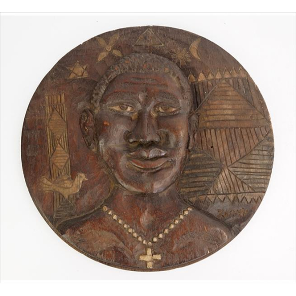 EspañolGERONIMO, Talha de madeira representando figura com diversos símbolos, estilo Arte Popular, assinado no verso. Diam. 41cm. Brasil, séc. XX