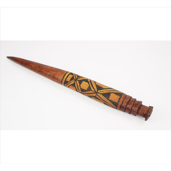 EspañolInstrumento indígena conhecido como pau de cavoco, utilizado para manejo do chão e possivelmente colheita da mandioca, atribuído à tribo Mehinako. Comp. 51 x 06 x 05cm. Brasil, séc. XX
