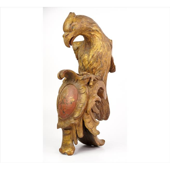 EspañolEscultura de madeira entalhada, policromada e dourada, representando ornamento nafigura de águia sobre escudo floral. Alt. 51 x 16 x 27cm. Brasil, séc. XVIII