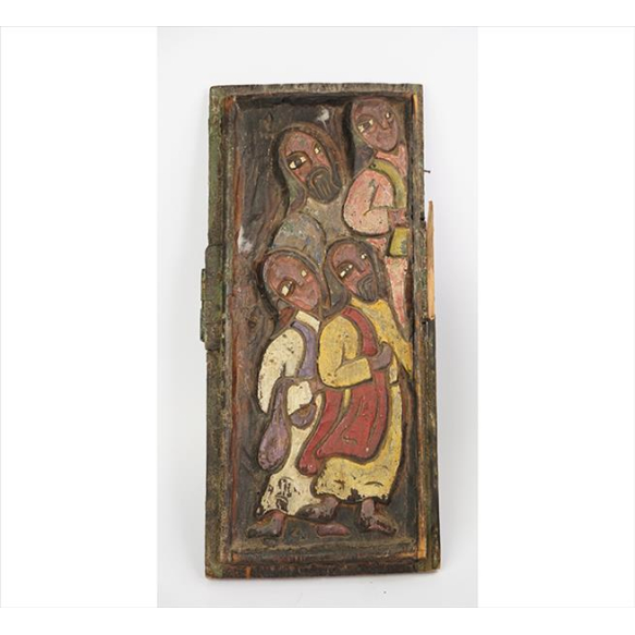 EspañolJESUÍNO, Talha de madeira policromada, representando figuras sacras, anteriormente utilizado como porta, possivelmente de oratório, estilo Arte Popular, assinado no verso. 48 x 22 x 03cm. Brasil, séc. XX