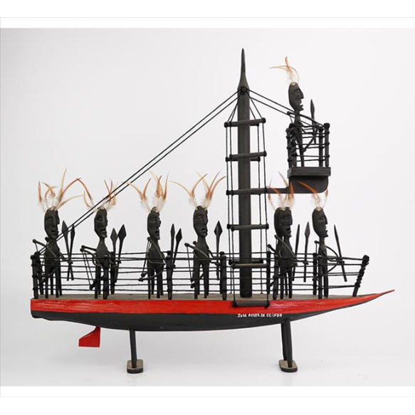 EspañolJOSE ALVES DE OLINDA, Grupo escultórico de madeira policromada, representando diversas figuras em embarcação, detalhes de penas, estilo Arte Popular, assinado. Alt. 59 x 66 x 09cm.