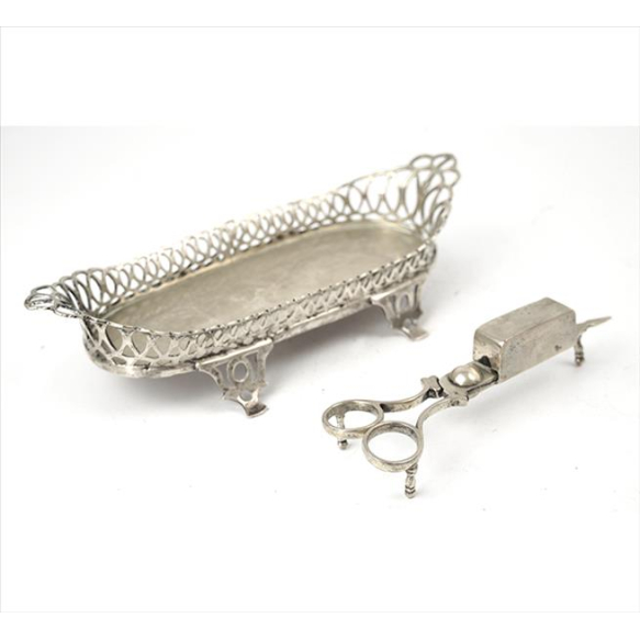 EspañolEspivitadeira de prata-de-lei sem contraste, bandeja com galeria fenestrada. Alt. 06 x 23 x 08cm. (total). Brasil, séc. XIX