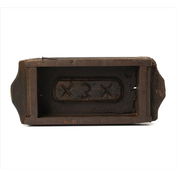 EspañolForma antiga para tijolos, estrutura de madeira com suportes de ferro, inscrição X3X. Alt. 08 x 35 x 14cm. Brasil, séc. XIX