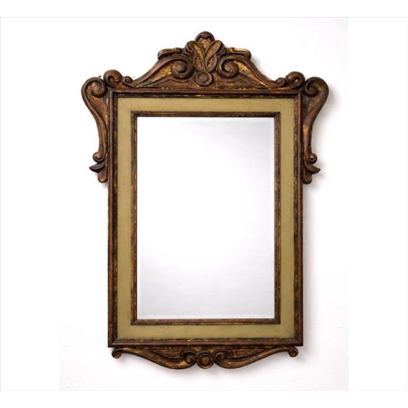 EspañolEspelho com moldura de madeira entalhada e dourada, ornamentado com volutas. Alt. 137 x 100cm (total c/ moldura). Brasil, séc. XIX