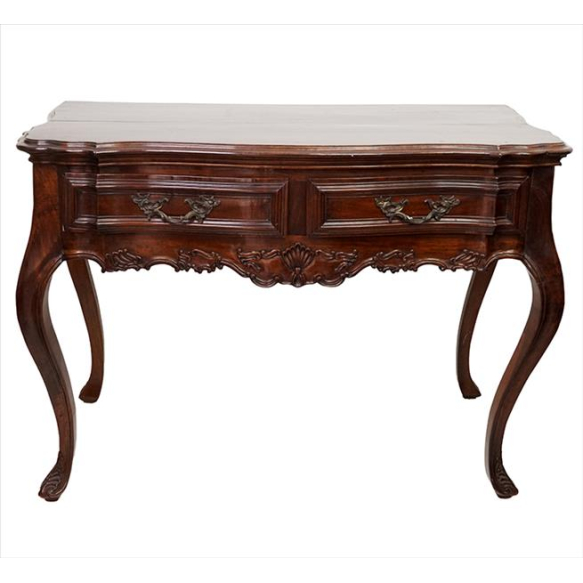 EspañolMesa de encostar de madeira nobre, Estilo D. João, detalhes finamente entalhados representando ramagens e rocalhas, contém duas gavetas frontais com almofadados e puxadores de bronze, pernas ligeiramente recurvas. Alt. 77 x 100 x 53cm. Brasil, séc. XIX (com sinais de uso/manuseio, precisa lustração)