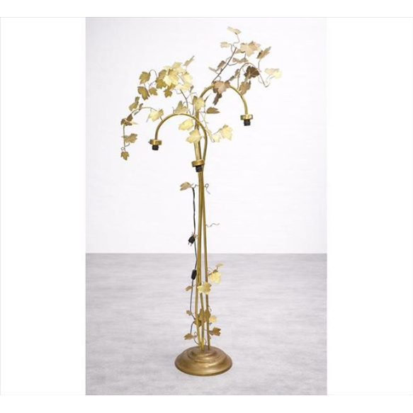 EspañolLuminária de chão com estrutura de metal dourado, ornamentada com folhagens diversas, contém três braços com pontos para luz. Alt. 175 x 84 x 50cm. Brasil, séc. XX