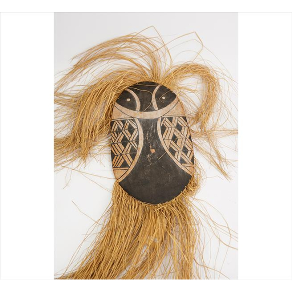 EspañolMáscara indígena de madeira policromada, extremidades de palha, atribuído à etnia Kalapalo do Alto do Xingu. 50 x 27cm. Brasil, séc. XX