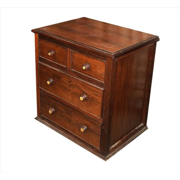 EspañolMini-cômoda de madeira nobre jacarandá, maciço e folheado, contendo 04 gavetas frontais, puxadores torneados e colunas laterais caneladas. Alt. 59 x 57 x 40cm. Brasil, séc. XX