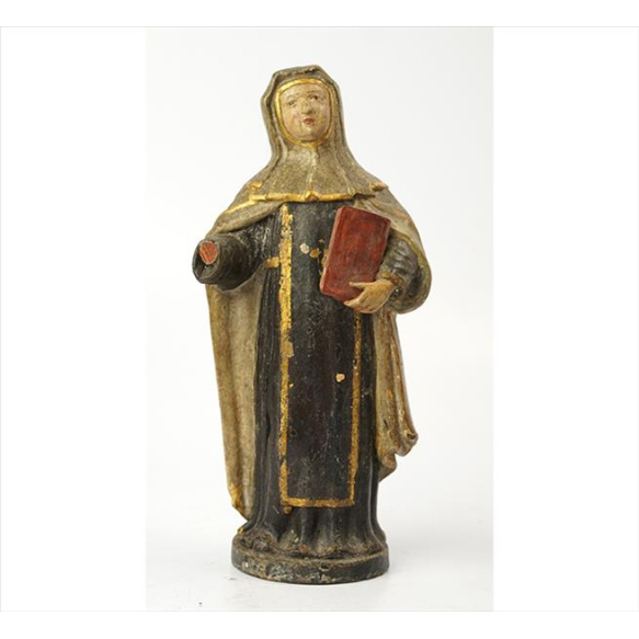EspañolSANTA TERESA, Imagem de barro policromado e dourado. Alt. 25 x 11 x 08cm. Brasil, séc. XVII