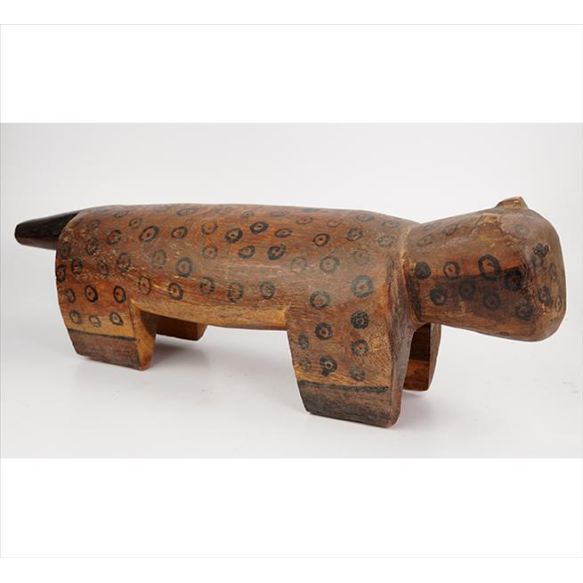 EspañolBanco indígena de madeira nobre policromada, representando figura de onça-pintada. Alt. 21 x 70 x 20cm. Brasil, meados séc. XX