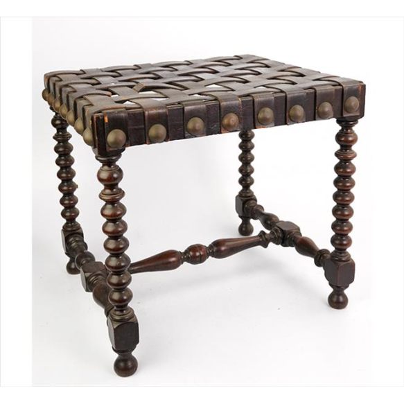 EspañolMocho de madeira nobre finamente torneada, assento com percintas de couro natural entrelaçadas, terminando em grandes tarraxas. Alt. 42 x 46 x 40cm. Brasil, séc. XIX . (couro no estado / precisa refazer percintas)