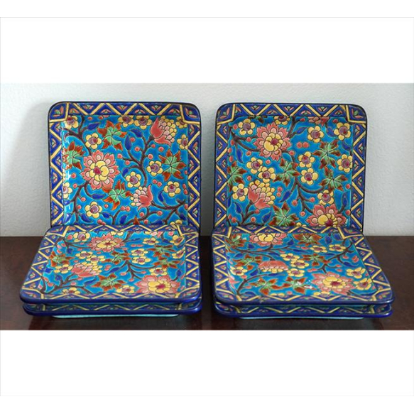 EspañolMAUX LONGWY, Conjunto de 06 pratos/covilhetes de cerâmica esmaltada à mão, ornamnetados com motivos florais, marca da manufatura sob a base. 16 x 16cm cada. França, séc. XX (um com restauro)