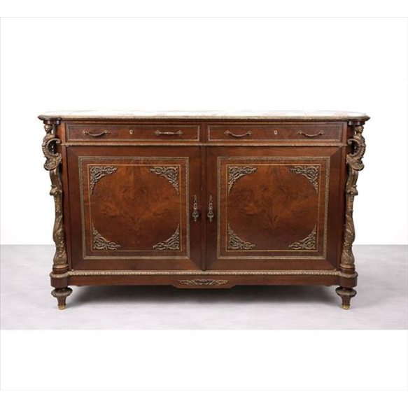 EspañolMóvel etajer de madeira nobre, robusta estrutura contendo duas portas e duas gavetas frontais, sendo estas com fechaduras de marfim, detalhes de bronze, colunas laterais em forma de cariátides finamente ornamentadas com volutas e ramagens, parte interna com 12 gavetas, tampo de mármore branco. Alt. 114 x 162 x 65cm. França, séc. XIX (tampo com trincado)
