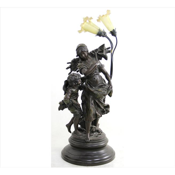 EspañolAUGUSTE MOREAU, grande Escultura de petit bronze com resquícios de patina, representando figura de camponeses, com luminária de três pontos na parte de trás, assinada. Alt. 80 x 40 x 30cm. França, séc. XIX/XX