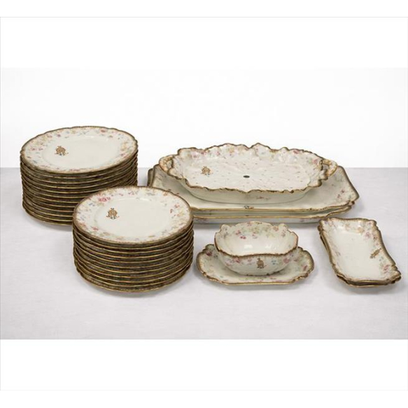 EspañolHAVILAND LIMGOES, Remanescente de aparelho de jantar de porcelana, finamente ornamentado com motivos florais e douração, com monograma gravado nas peças, contendo 11 pratos rasos, 11 pratos sobremesa, 02 travessas retangular, 01 travessa com suporte, 01 molheira 02 covilhetes. França, séc. XIX (com pequenos bicados)