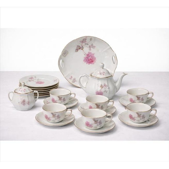 EspañolEAMAG ALT SCHONWALD, Jogo de chá de porcelana europeia, ornamentado com motivos florais, contendo 06 xícaras para chá com respectivos pires, 06 pratos para bolo, 01 açucareiro e 01 bule, marca da manufatura sob a base. Bavaria, início séc. XX (tampa do bule com fio de cabelo)