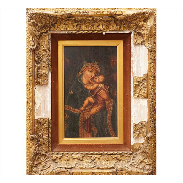 EspañolQuadro sem assinatura do artista, Madona e Bambino, óleo sobre madeira de carvalho. 36 x 20 cm. Europa séc. XVII (moldura no estado)