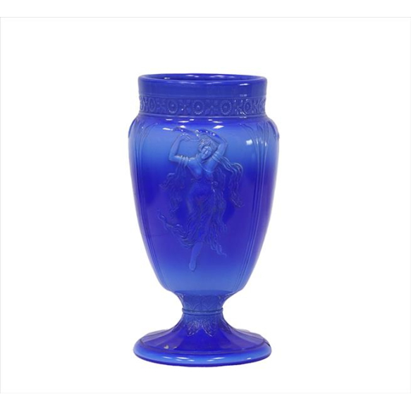 EspañolVaso de vidro artístico, ornamentado com figuras clássicas e ramagens, tonalidade azul. Alt. 23 x 10cm. Europa, séc. XX