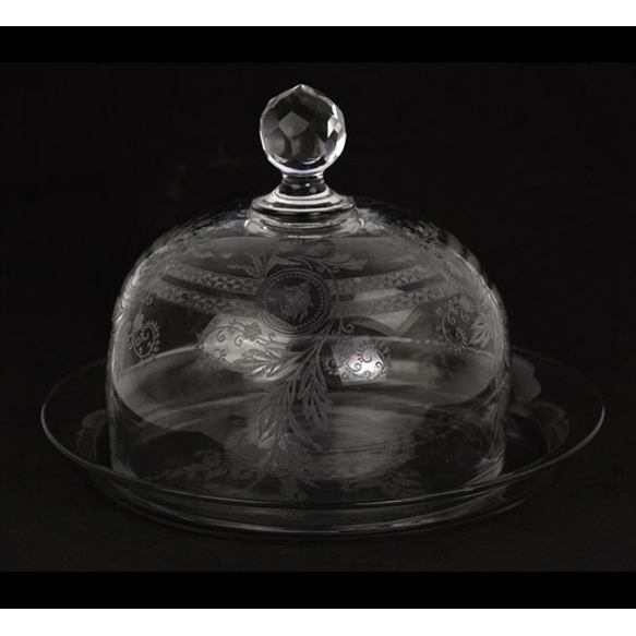 EspañolQueijeira de cristal decorada com guirlandas e ramagens acidadas. Alt. 17 x 23cm. Europa, início séc. XX