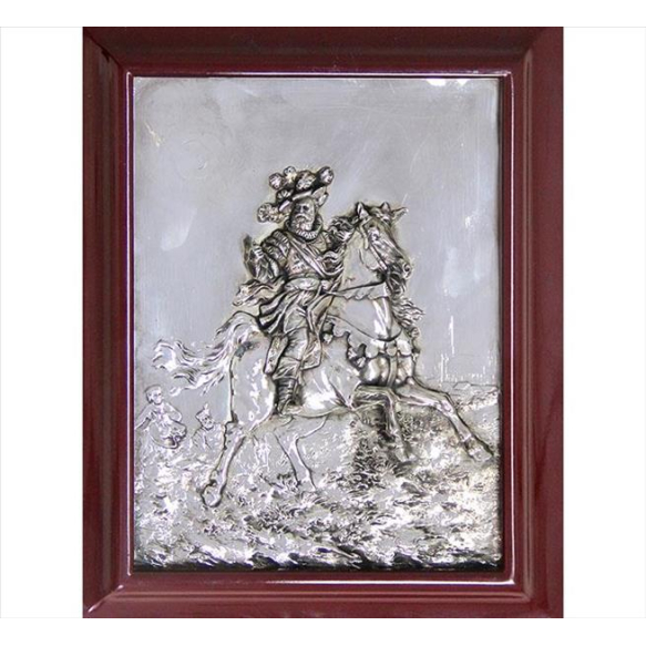EspañolPlaca de bronze espessurado à prata, representando figura de nobre à cavalo, trabalhado em relevo. 28 x 21cm. Europa, séc. XIX/XX
