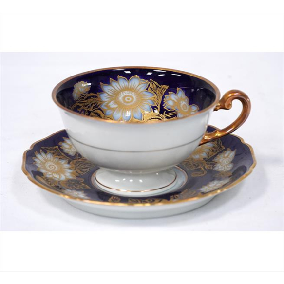 EspañolHUTSCHENREUTHER, Xícara de porcelana esmaltada, decorada com motivos florais sobre fundo azul cobalto, marca da manufatura sob a base. Alt. 07 x 14cm. (Total). Início séc. XX