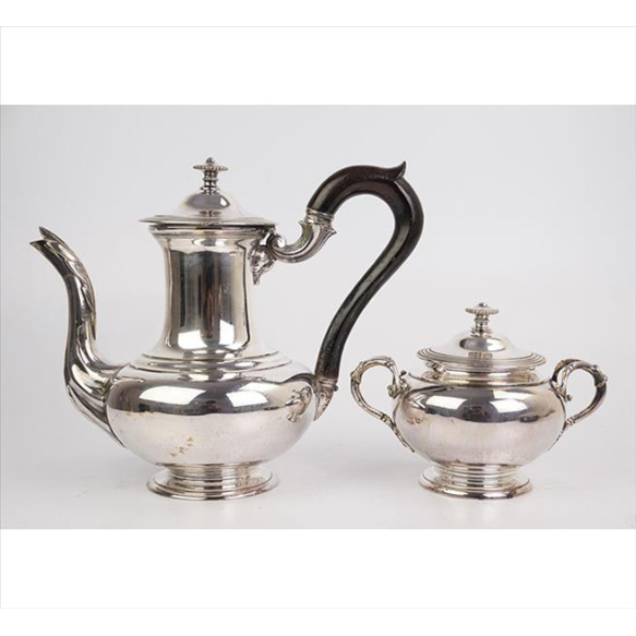 EspañolConjunto de bule e açucareiro de metal espessurado à prata, timbre 1878 e escudo de armas sob a base, ornamentados com frisos e ramagens, pega do bule de madeira. Alt. 24 x 29 x 15cm e 13 x 18 x 13cm.