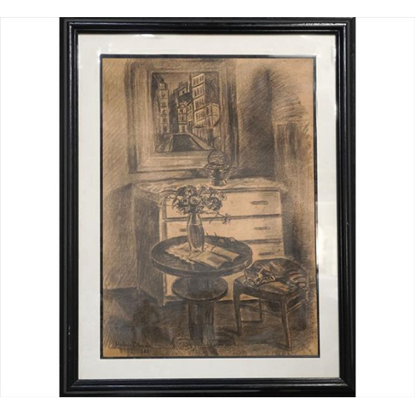 EspañolHELENA OHASHI, Interior com Gato, Desenho à Carvão, ACIE, 64 x 45cm. (m.i). Datado 1953