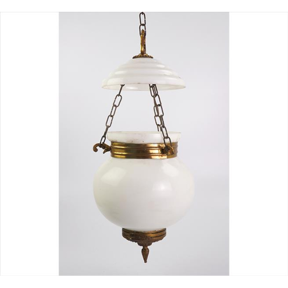 EspañolLuminária pendente com cúpula de vidro opalado, detalhes de bronze e metal dourado. Alt. 57 x 23cm (total c/ corrente). Início séc. XX
