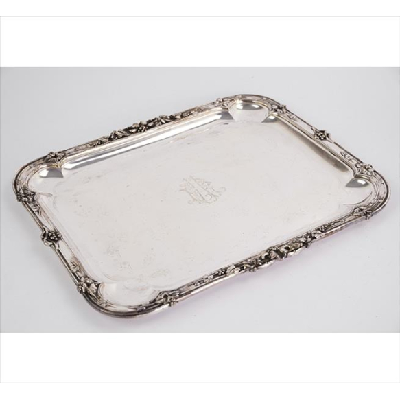 EspañolCHRISTOFLE, Travessa de metal espessurado à prata, finamente ornamentada com parras de uvas em relevo, parte central com monograma P.A.R. 39 x 31cm. França, início séc. XX