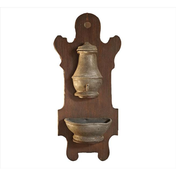 EspañolFonte de parede com estrutura de madeira, suporte superioe e inferior de estanho. Alt. 79 x 32 x 20cm. Europa, início séc. XX