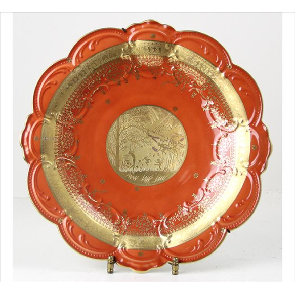 EspañolTIRSCHENREUTH, Prato medalhão de porcelana esmaltada, ricamente ornamentado com diversas figuras, guirlandas e seres mitológicos, marca da manufatura sob a base. Diam. 32 x 05cm. Alemanha, início séc. XX