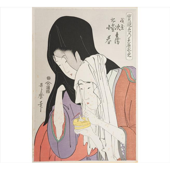 EspañolKITAGAWA UTAMARO, Jitsukyo Iro no Bi Meikemi - Maiya Jihei e Kinokuniya Koharu, Xilogravura Ukiyo-e, assinada. 39 x 26cm (sem moldura). Japão, séc. XX (com fungos)