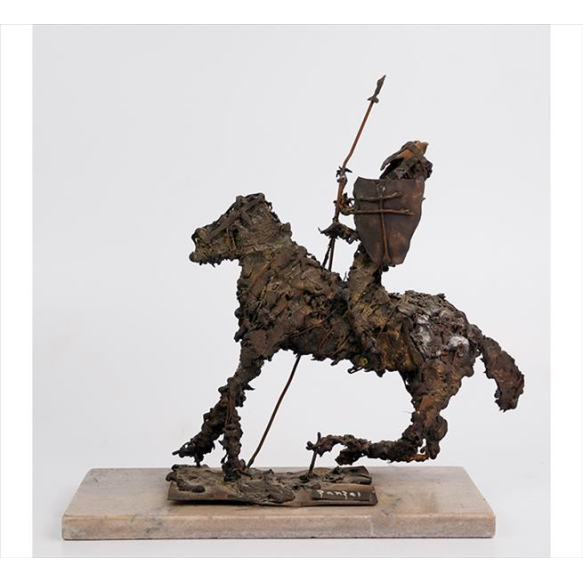 EspañolPANZAI, Escultura de ferro patinado representando figura de guerreiro, assinada, sobre base de pedra. Alt. 33 x 34 x 15cm (total c/ base)