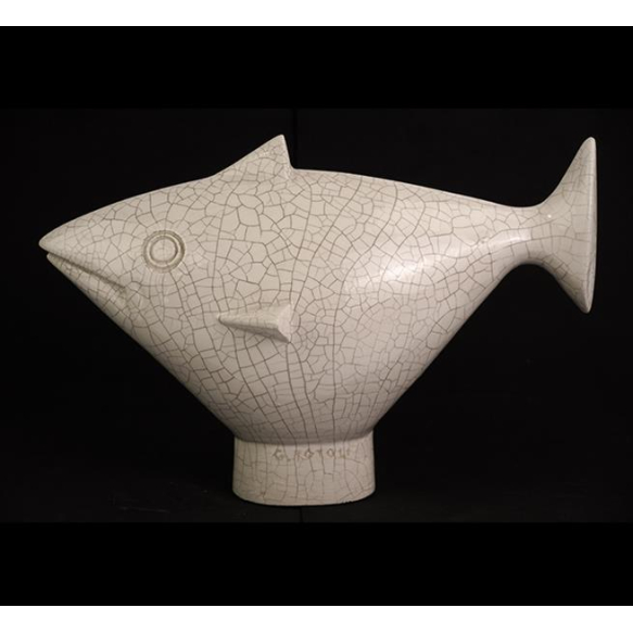 EspañolGUIDO TOTOLI, Peixe, Escultura de cerâmica craquelada e esmaltada, assinada. Alt. 27 x 40 x 20cm.