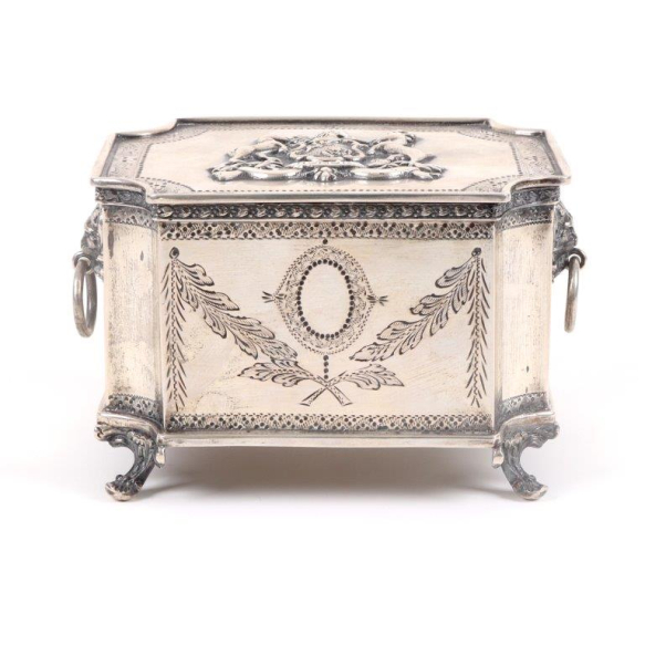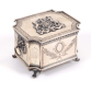 Bela caixa porta jóias em prata de lei contrastada 833, com alças laterais trabalhada representando cabeça de leão, na tampa na parte central com um brasão em relevo. 10 cm alt, 15 x 13 cm.