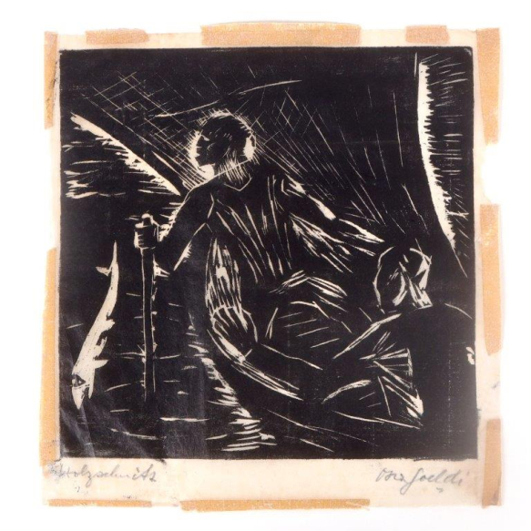 Oswaldo Goeldi - Pescadores no Mar - Xilogravura s/ papel arroz - ass. cid e no cie em alemão, Holzschnitt (Xilogravura) - c. 1924 - obra dessa edição reproduzida no livro Oswaldo Goeldi na Coleção Hermann Kummerly, pg. 155 - 16,6 X 15,5 cm - não emoldurado