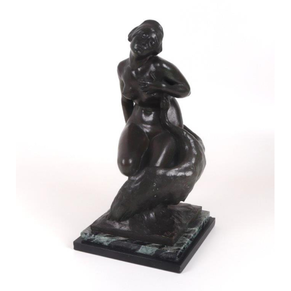 ANTONIO BESESTI(1865-1938)- Escultura executada em bronze eepresentando, mulher desnuda com sisne. 46 cm alt. Antonio Besesti (1865–1938) foi um escultor italiano de Gênova, conhecido por suas esculturas funerárias em bronze e mármore. Atuou principalmente no final do século XIX e início do XX, com destaque no Cemitério Monumental de Staglieno. Seu estilo transitou do realismo burguês ao Liberty (Art Nouveau), influenciado por Leonardo Bistolfi. Em 1920, foi reconhecido como acadêmico de mérito pela Accademia Ligustica.