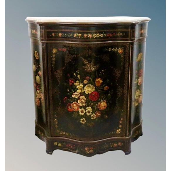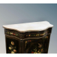 Dunquerque oriental em madeira laqueada, decorada com pintura de flores e guirlandas, tampo em mármore branco. Internamente possui duas prateleiras. 1,08 m de altura x 1,03 m de largura x 0,47 m de profundidade.