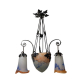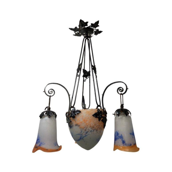 Noverdy - France. Lustre em "Fer Forgé" com peça central e tres partes em "patè de verre". Todas as partes de cristal assinadas Noverdy - France. França, 1940. 60 x 40 cm.
