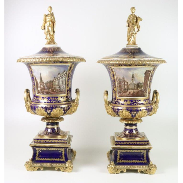 Par de Imponentes Ânforas da rara manufatura de Bloor Derby, representando cena de edificações estas de grande qualidade de esmaltagem - 86 cm alt, 36 cm diâm- uma das ânforas com restauro. Em 1756, três homens, John Heath um banqueiro do Derby, Andrew Planche um "fabricante de porcelana" e William Duesbury um esmalte de Staffordshire, firmaram um acordo pelo qual se tornaram "coparceiros juntos, bem como na arte de fazer a porcelana inglesa. John Heath, um vereador de Derby, foi o financiador do empreendimento, contribuindo com £1.000; Andrew Planche, o oleiro, e William Duesbury, o artista e força motivadora. A fábrica foi estabelecida na Estrada Nottingham.