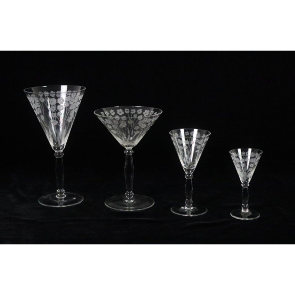 Taças em cristal lapidado francês, Saint Louis, decoradas com pequenas flores jateadas. Número de peças: 5 Taças para vinho,5 Taças para água sendo uma no estado;4 Taças para champagne - 9 Taças para vinhos fortificados - 6 Taças para licor cristal da Bohemia lapidado - maior taça medindo 18 cm alt.(6 taças com bicados)
