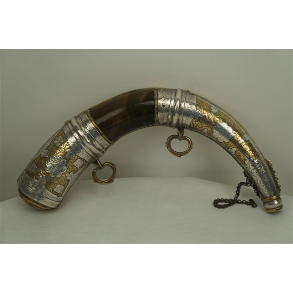 Importante Polverinho executado em chifre , latão e prata de lei decorado com motivos Persas , peça de dimensão rara . Oriente inicio do Séc XIX - 34 cm de comp.